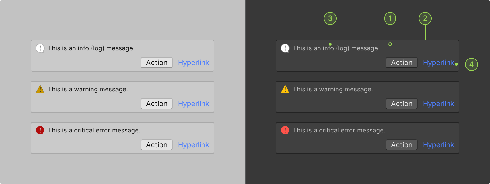 Help boxes appear below the affected area (for example a property in the Inspector window) and shift the content below it.